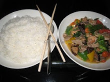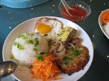 Sau đó thì cho lửa medium thôi, không cho dầu vô chảo đâu, múc bột vô chảo tráng cho mỏng đều rồi lấy nấp đậy lại chừng 1-2 phút giở nấp ra thấy bột trong đẹp không bị lang beng ... là bột chín . Tắt lửa, mở nấp ra rồi đập cái chảo cái đùng lên tấm thớt cho rớt bánh ra, nếu bánh không rớt ra thì đưa tay vô khều cái mép bánh xí thì nó rớt xuống liền . Xong để đó, mở bếp lên medium, múc bột tráng chảo làm y như lần đầu, rồi để đó, qua bên cái thớt cuốn bánh lại, cắt bỏ cái ria cho nó bằng cho đẹp . Cuốn bánh xong thì bánh trên chảo cũng vừa chín tới